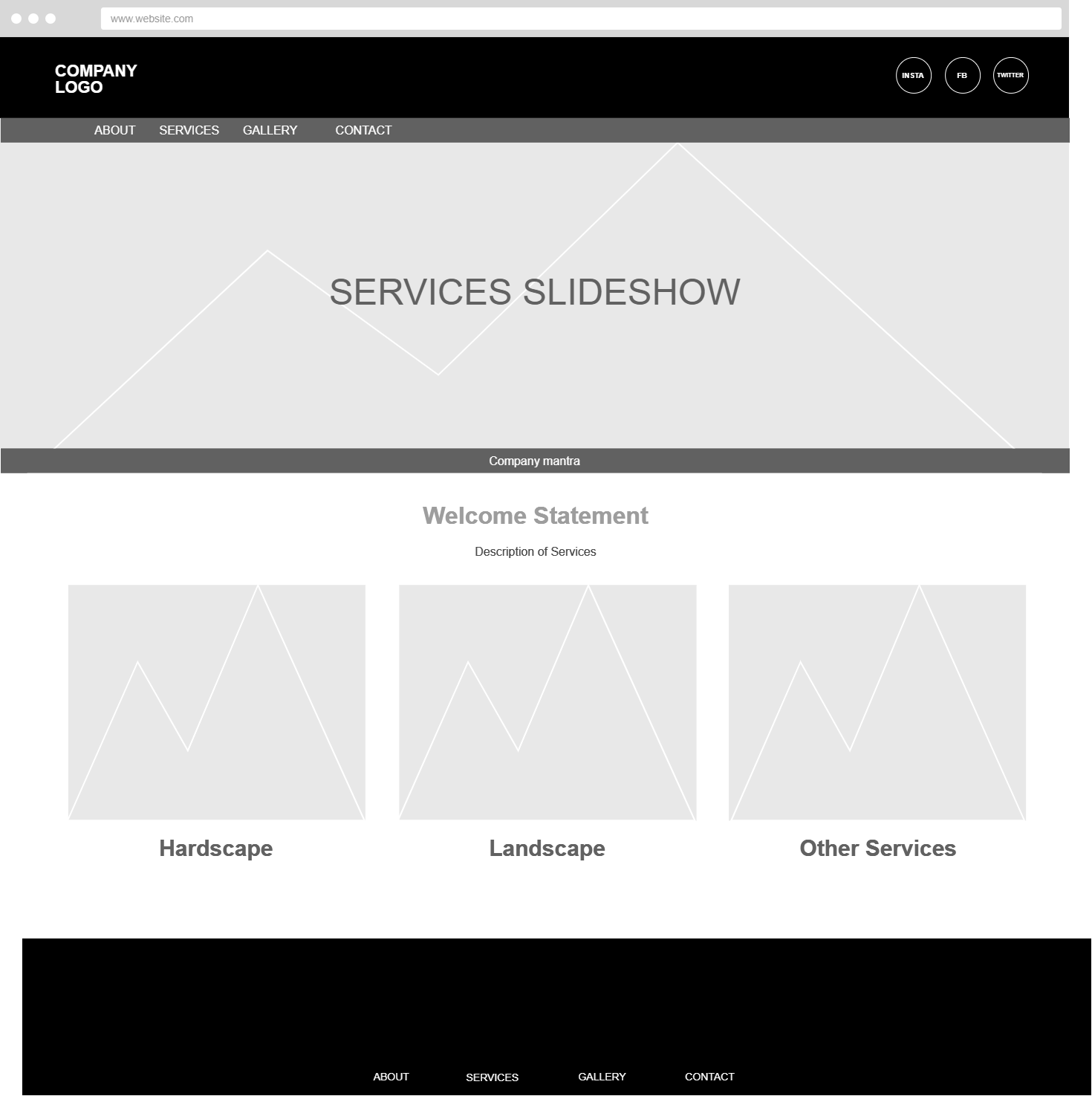 Below that, I included a card design feature which shows the three main service categories (hardscape, landscape, and other services. The user is given the ability to click on which service they are interested in. This provides an alternative navigation for the customer. While this does the same thing as the primary navigation, it is appealing and can reduce the number of clicks for the customer to get to where they want to be. It also provides information to the customer with out overloading the page with detailed information that can distract from the purpose of the site.